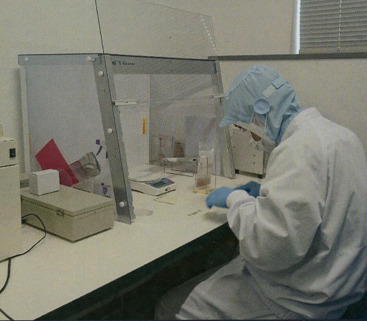 作業前には必ずエアーシャワーを使い目に見えない微小なゴミを吹き飛ばし、衛生的な環境にて作業を行います。